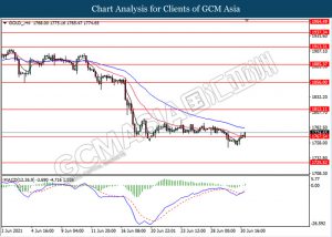 GOLD_, H4: Harga emas telah didagang dengan lebih tinggi susulan dengan lantunan dari tahap sokongan 1767.55. MACD yang memaparkan isyarat momentum bullish dengan formasi silang emas mencadangkan komoditi ini untuk melanjutkan keuntungannya ke arah tahap rintangan 1812.10.