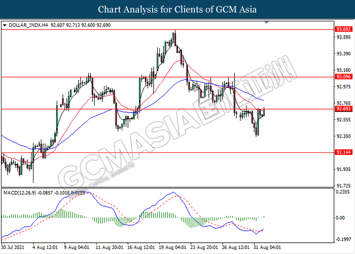 DOLLAR_INDX, H4: Indeks dolar telah didagang dengan lebih tinggi sementara ia sedang menguji tahap rintangan 92.70. MACD yang memaparkan isyarat bias bullish dengan formasi silang emas mencadangkan dolar untuk melanjutkan lantunannya selepas ia memecah tahap rintangan tersebut.