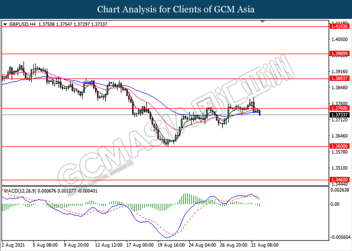 GBPUSD, H4: GBPUSD telah didagang dengan lebih rendah susulan dengan pengunduran dari tahap rintangan 1.3760. MACD yang memaparkan isyarat momentum bearish dengan formasi silang kematian mencadangkan pasangan ini untuk melanjutkan kerugiannya ke arah tahap sokongan 1.3600.