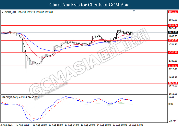 GOLD, H4: Harga emas telah didagang dengan rata susulan dengan pengunduran dari tahap tingginya. Namun, MACD yang memaparkan isyarat momentum bearish mencadangkan komoditi ini untuk didagang dengan lebih rendah dalam jangka pendek ke arah tahap sokongan 1792.35.