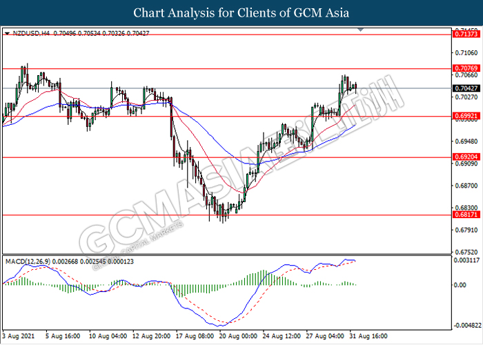 CrudeOIL, H4: Harga minyak mentah telah didagang dengan lebih tinggi susulan dengan lantunan dari tahap sokongan 68.35. Namun, MACD yang memaparkan isyarat momentum bearish yang berkurangan mencadangkan komoditi ini untuk melanjutkan pengundurannya ke arah tahap rintangan 71.00.