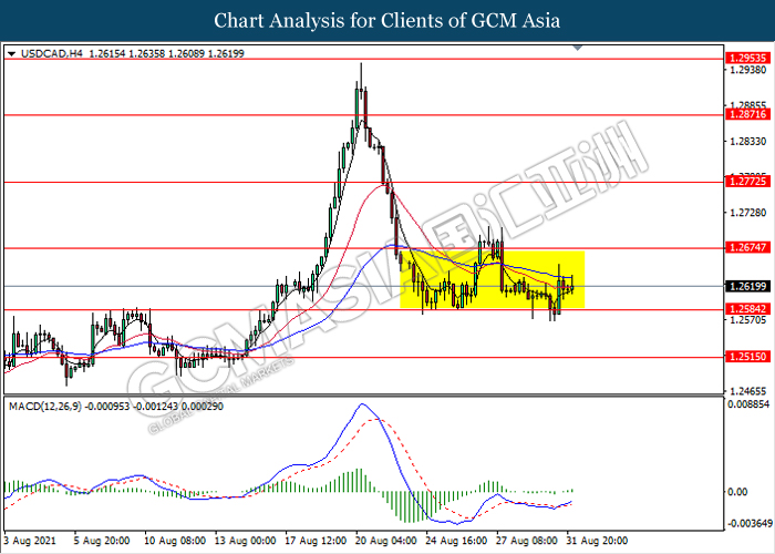 USDCAD, H4: USDCAD kekal didagang dalam saluran sisi susulan dengan lantunan dari tahap sokongan 1.2585. Namun, MACD yang memaparkan isyarat momentum bullish dengan formasi silang emas mencadangkan pasangan ini untuk melanjutkan lantunannya ke arah tahap rintangan 1.2675.