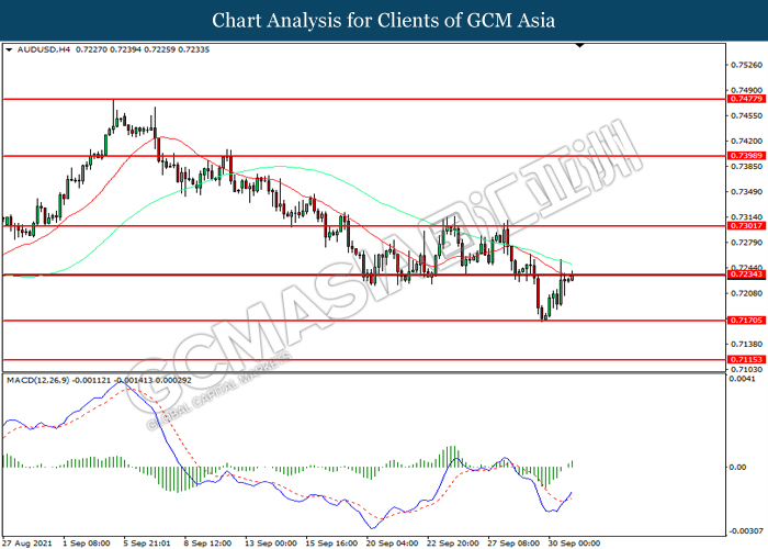 AUDUSD, H4: AUDUSD telah didagang dengan lebih tinggi sementara kini menguji di tahap rintangan 0.7235. MACD yang memaparkan momentum bullish mencadangkan pasangan ini untuk melanjutkan keuntungannya selepas ia memecah tahap rintangan tersebut.