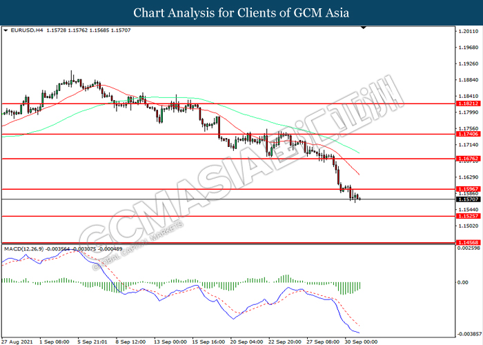 EURUSD, H4: EURUSD telah didagang dengan lebih rendah selepas ia memecah tahap sokongan terdahulu 1.1595. Namun, MACD yang memaparkan momentum bearish yang berkurangan mencadangkan pasangan ini untuk mengalami pembetulan teknikal bagi jangka pendek.