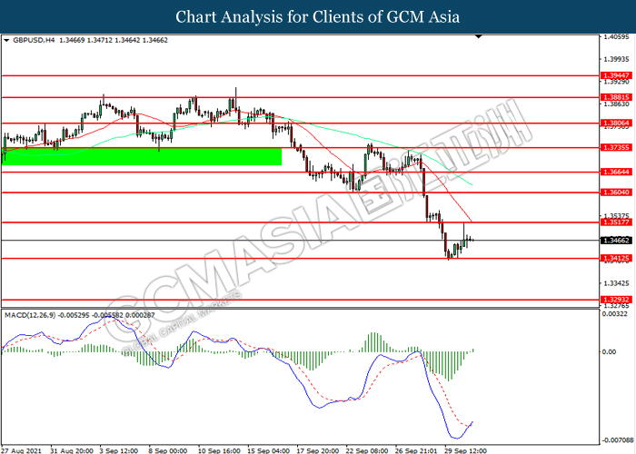GBPUSD, H4: GBPUSD telah didagang dengan lebih tinggi sementara kini menguji di tahap rintangan 1.3515. MACD yang memaparkan momentum bullish mencadangkan pasangan ini untuk melanjutkan keuntungannya selepas ia memecah tahap rintangan tersebut.