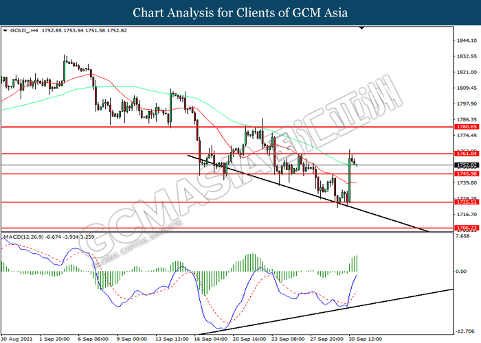 GOLD_, H4: Harga emas telah didagang dengan lebih tinggi sementara kini menguji di tahap rintangan 1761.05. MACD yang memaparkan momentum bullish mencadangkan pasangan ini untuk melanjutkan keuntungannya selepas ia memecah tahap rintangan tersebut.