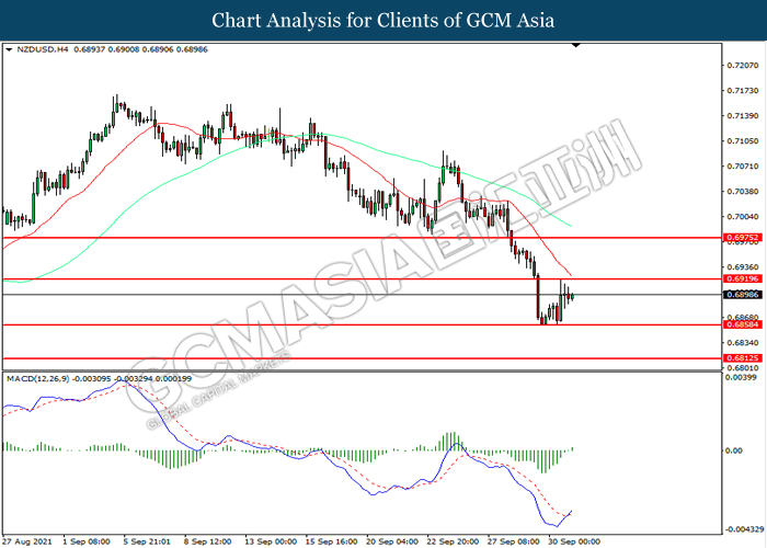 NZDUSD, H4: NZDUSD telah didagang dengan lebih tinggi sementara kini berhampiran dengan tahap rintangan 0.6920. MACD yang memaparkan momentum bullish mencadangkan pasangan ini untuk melanjutkan keuntungannya selepas ia memecah tahap rintangan tersebut.