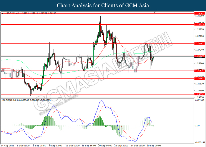 USDCAD, H4: USDCAD telah didagang dengan lebih tinggi sementara kini menguji di tahap rintangan 1.2690. Namun MACD yang memaparkan momentum bearish yang berkurangan mencadangkan pasangan ini untuk mengalami pembetulan teknikal bagi jangka pendek.