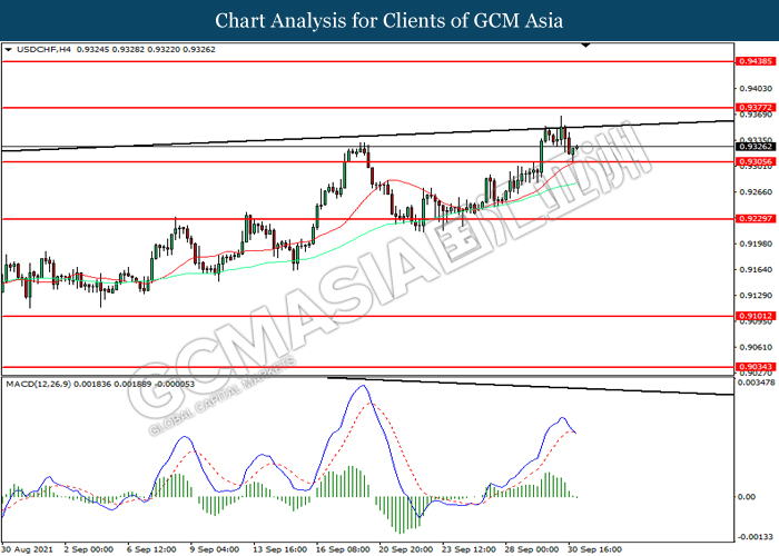 USDCHF, H4: USDCHF telah didagang dengan lebih rendah sementara kini menguji di tahap skongan 0.9305. MACD yang memaparkan momentum bearish mencadangkan pasangan ini untuk melanjutkan kerugiannya selepas ia memecah tahap sokongan tersebut.