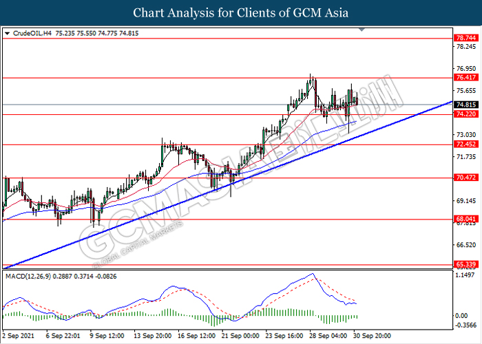 Di pasaran komoditi, harga minyak mentah melonjak sebanyak 0.11% kepada $75.18 setong semasa penulisan berikutan dengan prospek permintaan yang positif terhadap pasaran minyak. Menurut kepada laporan tersebut, China telah membuat pesanan besar minyak sebagai persediaan untuk musim sejuk yang akan datang demi untuk mengelakkan kekurangan tenaga. Sebaliknya, harga emas turun sebanyak 0.10% kepada $ 1753.03 se troy auns di tengah-tengah pengukuhan dolar AS.