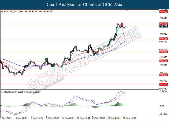 DOLLAR_INDX, H4: Indeks dolar telah didagang dengan lebih tinggi sementara ia sedang menguji berhampiran dengan tahap rintangan 94.35. Namun, MACD yang memaparkan isyarat momentum bullish mencadangkan dolar untuk didagang dengan lebih rendah sebagai pembetulan teknikal ke arah tahap sokongan 93.70.