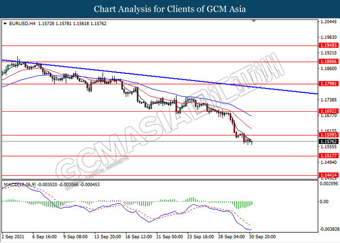 EURUSD, H4: EURUSD telah didagang dengan lebih rendah susulan dengan pemecahan pada tahap sokongan sebelumnya 1.1600. Namun, MACD yang memaparkan isyarat momentum bearish yang berkurangan mencadangkan pasangan ini untuk didagang dengan lebih tinggi sebagai pembetulan teknikal ke arah tahap 1.1600.