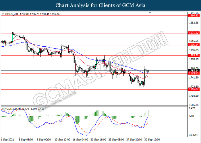 GOLD, H4: Harga emas telah didagang dengan lebih tinggi susulan dengan pemecahan pada tahap rintangan sebelumnya 1749.95. MACD yang memaparkan isyarat momentum bullish mencadangkan komoditi ini untuk melanjutkan keuntungannya ke arah tahap rintangan 1785.80.