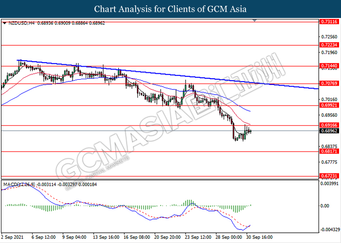 NZDUSD, H4: NZDUSD telah didagang dengan lebih tinggi sementara ia sedang menguji berhampiran dengan tahap rintangan 0.6915. MACD yang memaparkan isyarat bias bullish dengan formasi emas mencadangkan pasangan ini untuk melanjutkan keuntungannya selepas ia memecah tahap rintangan tersebut.