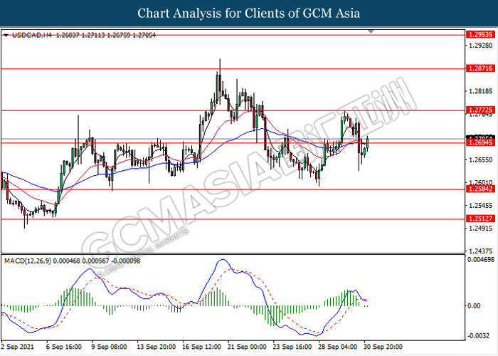 USDCAD, H4: USDCAD telah didagang dengan lebih tinggi sementara ia sedang menguji tahap rintangan 1.2695. Namun, MACD yang memaparkan isyarat bias bearish mencadangkan pasangan ini untuk didagang dengan lebih rendah ke arah tahap sokongan 1.2585.