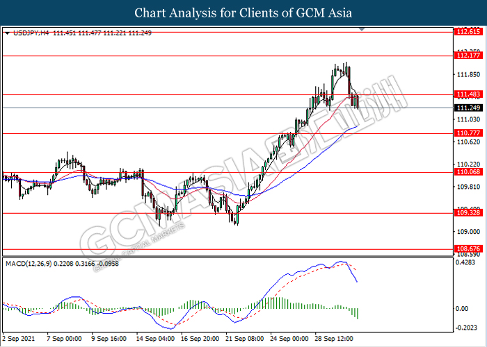 USDJPY, H4: USDJPY telah didagang dengan lebih rendah susulan dengan pemecahan pada tahap sokongan sebelumnya 111.50. MACD yang memaparkan isyarat momentum bearish mencadangkan pasangan ini untuk melanjutkan kerugiannya ke arah tahap sokongan 110.75.