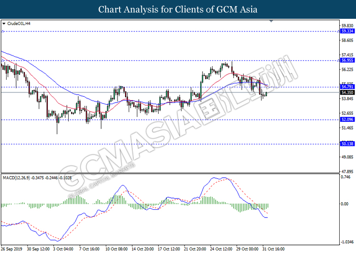 CrudeOIL, H4: Harga minyak mentah telah didagang dengan lebih rendah berikutan dengan pemecahan pada tahap sokongan sebelumnya 54.80. Namun, MACD yang memaparkan isyarat momentum bearish yang telah berkurangan mencadangkan komoditi ini untuk mengalami pembetulan teknikal jangka pendek ke arah tahap rintangan 54.80.