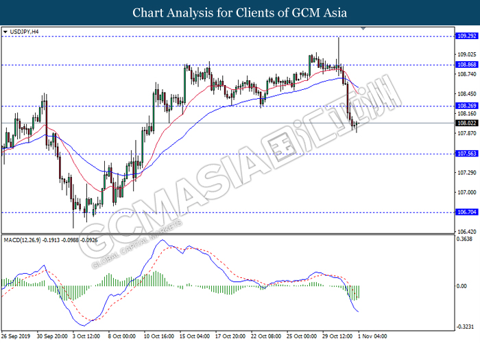 USDJPY, H4: USDJPY telah didagang dengan lebih rendah berikutan dengan pemecahan pada tahap sokongan sebelumnya 108.25. Namun, MACD yang memaparkan isyarat momentum bearish yang berkurangan mencadangkan pasangan ini untuk mengalami pembetulan teknikal jangka pendek ke arah tahap sokongan terkini di 108.25.