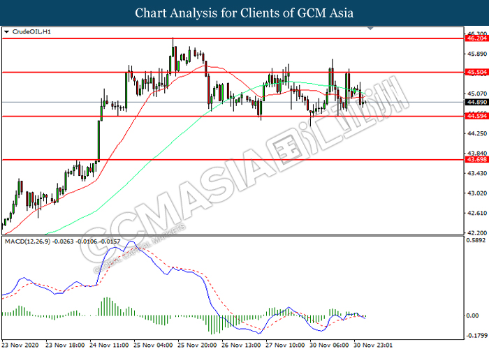 Di pasaran komoditi, harga minyak mentah turun sebanyak 0.04% kepada $ 44.99 setong semasa penulisan di tengah-tengah perbincangan OPEC yang ditangguhkan telah menimbulkan kebimbangan terhadap bekalan. Menurut kepada sumber dari Reuters, OPEC + menangguhkan perbincangan mereka mengenai dasar pengeluaran untuk tahun depan kepada Khamis kerana mereka masih tidak bersetuju mengenai berapa banyak minyak yang harus mereka pam di tengah-tengah permintaan yang lemah. Sebaliknya, harga emas kekal lemah dan turun sebanyak 0.11% kepada $1781.98 se troy auns pada masa penulisan kerana sentimen risiko tetap tinggi pada berita vaksin.