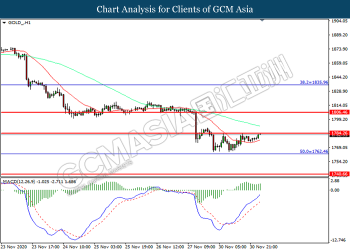 GOLD_, H1: Harga emas telah didagang dengan lebih tinggi sementara kini menguji di tahap rintangan 1784.25. MACD yang memaparkan momentum bullish mencadangkan komoditi ini untuk melanjutkan keuntungannya selepas ia memecah tahap rintangan tersebut.