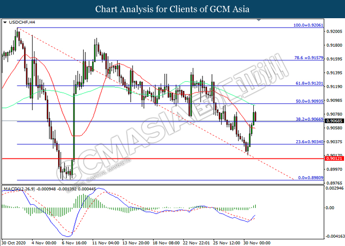 USDCHF, H4: USDCHF telah didagang dengan lebih rendah sementara kini menguji di tahap sokongan 0.9035. Namun, MACD yang memaparkan momentum bullish mencadangkan pasangan ini untuk mengalami pembetulan teknikal bagi jangka pendek.