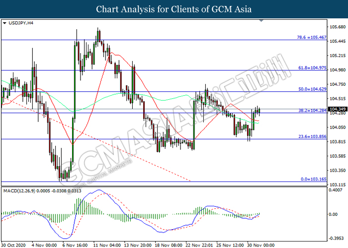 USDJPY, H4: USDJPY telah didagang dengan lebih tinggi selepas ia memecah tahap rintangan terdahulu 104.30. MACD yang memaparkan momentum bullish mencadangkan pasangan ini untuk melanjutkan keuntungannya ke arah tahap rintangan 104.65.