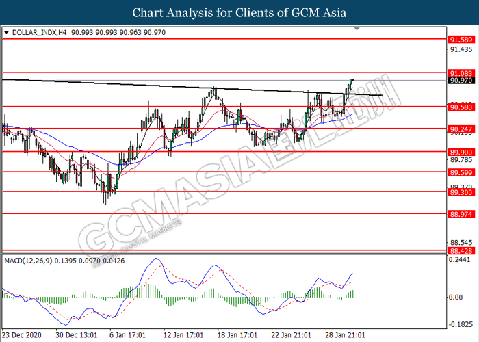 Indeks dolar yang mengukur nilainya berbanding sekumpulan enam mata wang utama melonjak dengan ketara sambil berayun berhampiran tahap tertinggi dalam tempoh 8 minggu di tengah kemungkinan Parti Biden mengabaikan penggubal undang-undang Republik untuk membiayai pelannya telah meningkat ketika kebuntuan perbincangan masih berterusan. Dalam perbincangan pusingan terakhir, sekumpulan 10 anggota Republikan telah memperkenalkan idea pelan rangsangan dengan nilai $600 bilion, kurang dari satu per tiga pelan rangsangan $ 1.9 trilion yang dikemukakan oleh Joe Biden pada hari pertama selepas beliau mengambil alih pejabat Rumah Putih daripada bekas Presiden Donald Trump. Ketidaksamaan pandangan terhadap amaun pakej rangsangan Presiden Joe Biden telah memicu permintaan pasaran terhadap mata wang selamat sambil membawa nilai dolar AS ke tahap yang lebih tinggi. Walaupun kedua belah pihak mempunyai jurang yang besar dalam pelan rangsangan itu, tetapi ia perlu diperhatikan bahawa Demokrat boleh menggunakan proses rekonsiliasi budget, yang dikenal sebagai langkah parlimen untuk membiayai pakej bantuan mereka jika parti pembangkang tidak menyokong idea tersebut. Walaupun demikian, rundingan lebih lanjut mengenai pelan bantuan Covid-19 akan terus dimantau oleh para pelabur untuk meneliti arah indeks dolar yang lebih lanjut. Semasa penulisan, indeks dolar meningkat 0.46% ke 91.00.