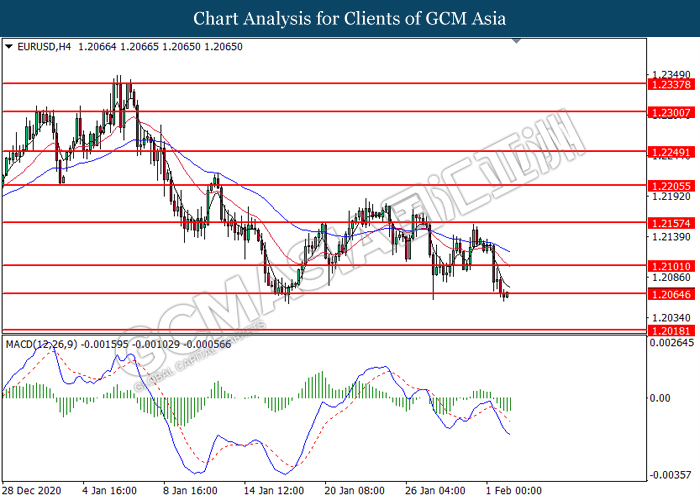 EURUSD, H4: EURUSD telah didagang dengan lebih rendah selepas ia memecah tahap sokongan sebelumnya di 1.2065. MACD yang memaparkan momentum bearish yang berterusan mencadangkan pasangan ini untuk melanjutkan kerugiannya dan menuju ke arah tahap sokongan di 1.2020.