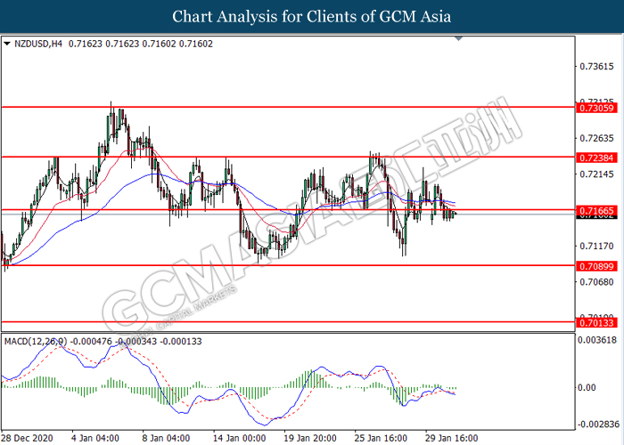 NZDUSD, H4: NZDUSD telah didagang dengan lebih rendah selepas ia memecah tahap sokongan sebelumnya di 0.7165. MACD yang memaparkan isyarat momentum bearish yang berterusan mencadangkan pasangan ini untuk melanjutkan kerugiannya dan menuju ke arah tahap sokongan di 0.7090.