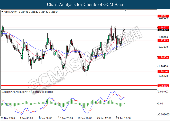 USDCAD, H4: USDCAD telah didagang dengan lebih tinggi sementara ia sedang menguji tahap rintangan di 1.2865. MACD yang menunjukkan isyarat momentum bullish mencadangkan pasangan ini untuk melanjutkan keuntungannya selepas ia memecah tahap rintangan tersebut.