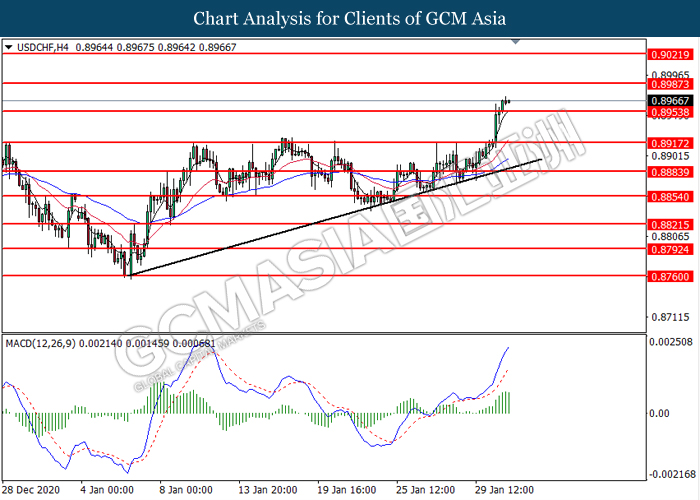 USDCHF, H4: USDCHF telah didagang dengan lebih tinggi selepas ia memecah tahap rintangan sebelumnya di 0.8955. MACD yang memaparkan momentum bullish yang berterusan mencadangkan pasangan ini untuk melanjutkan keuntungannya dan menuju ke arah tahap rintangan di 0.8985.