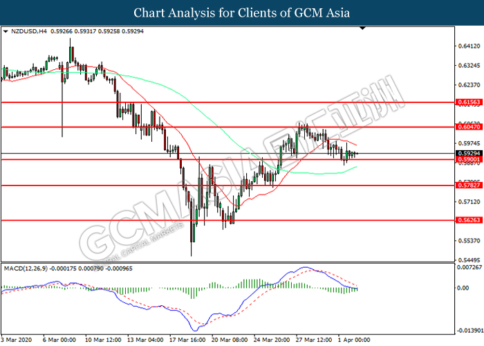 NZDUSD, H4: NZDUSD telah didagang dengan lebih rendah sementara kini menguji di tahap sokongan 0.5900. Namun, MACD yang memaparkan momentum bearish yang berkurangan mencadangkan pasangan ini untuk mengalami pembetulan teknikal bagi jangka pendek.