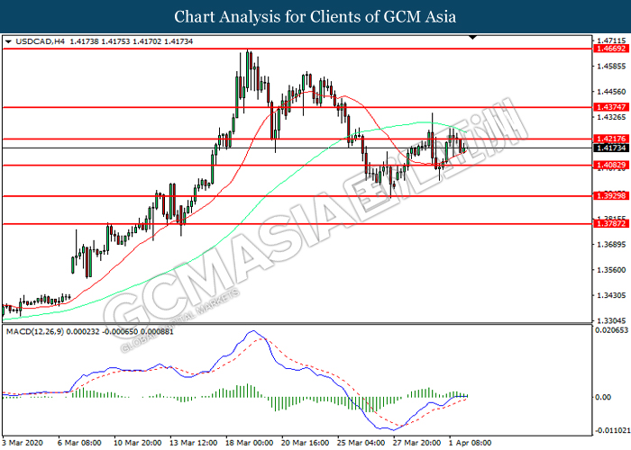 USDCAD, H4: USDCAD telah didagang dengan lebih rendah selepas ia berundur dari tahap rintangan 1.4215. MACD yang memaparkan momentum bullish yang berkurangan mencadangkan pasangan ini untuk melanjutkan kerugiannya ke arah tahap sokongan 1.4085.