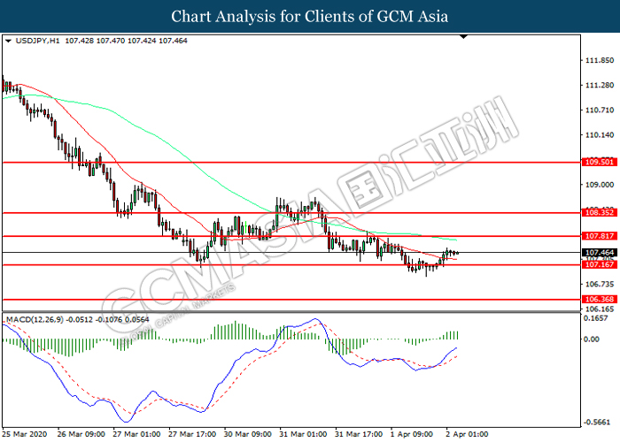 USDJPY, H1: USDJPY telah didagang dengan lebih tinggi selepas ia melantun dari tahap sokongan 107.15. MACD yang memaparkan momentum bullish mencadangkan pasangan ini untuk melanjutkan keuntungannya ke arah tahap rintangan 107.80.