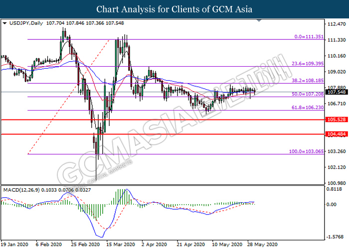 USDJPY, Daily: USDJPY telah didagang dengan lebih rendah selepas ia berundur dari tahap yang lebih tinggi. MACD yang menunjukkan isyarat momentum bullish yang berkurangan mencadangkan pasangan ini untuk melanjutkan kerugiannya dan menuju ke arah tahap sokongan di 107.20.