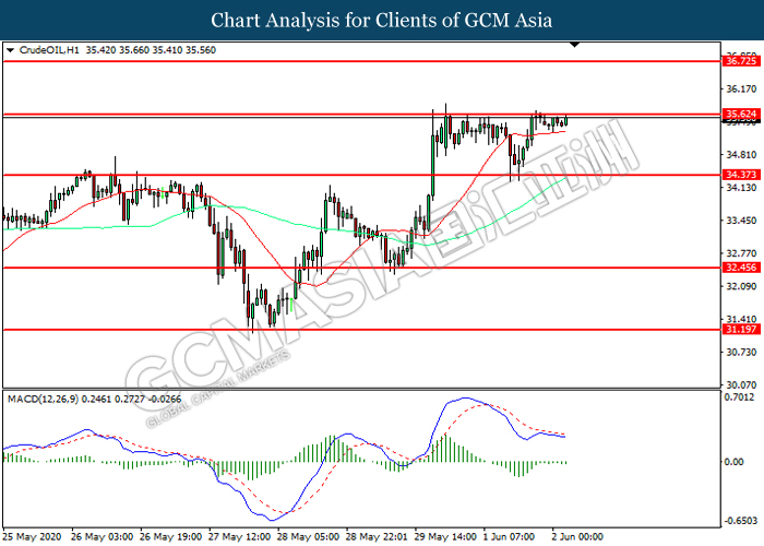 Di pasaran komoditi, harga minyak mentah kekal stabil dan menokok sebanyak 0.06% kepada $35.52 setong berikutan dengan jangkaan untuk melanjutkan pemotongan pengeluaran. Para pengeluar OPEC + sedang mempertimbangkan untuk melanjutkan pemotongan pengeluaran mereka sebanyak 9.7 juta tong sehari atau sekitar 10% daripada output global, sehingga Julai atau Ogos pada pertemuan dalam talian di 4 Jun. Sebaliknya, harga emas meningkat sebanyak 0.04% kepada $ 1739.33 se troy auns pada masa penulisan berikutan dengan kelemahan dolar dan ketidakpastian yang berterusan antara AS dan China