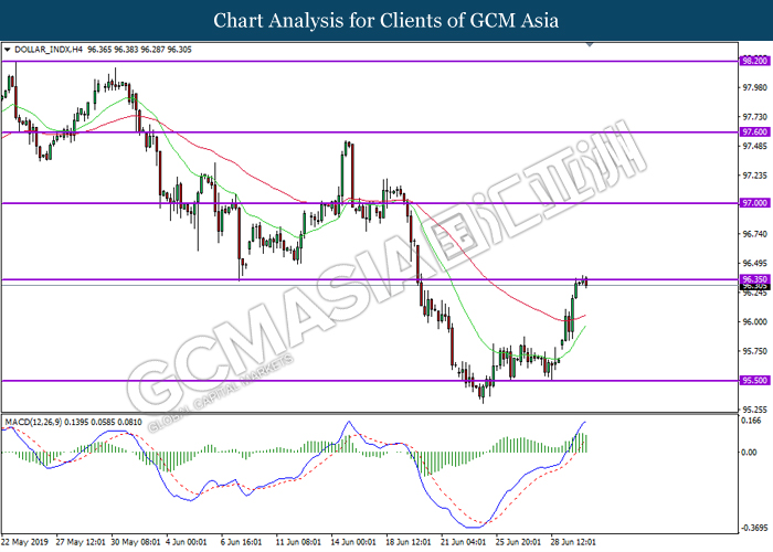 Indeks dolar yang mengukur nilainya berbanding dengan enam pasangan mata wang utama telah menyusut sebanyak 0.02% ke 96.40 semasa penulisan. Namun, momentum bagi dolar masih stabil selepas para pelabur memberi sentimen positif ke atas perkembangan perundingan perdagangan AS-China yang positif. Walaupun dengan data pembuatan yang lemah pada malam semalam, keyakinan para pelabur kekal optimis terhadap dolar dan kemungkinannya pencapaian perjanjian di antara dua ekonomi terbesar. Walau bagaimanapun, dolar masih ditekan oleh jangkaan pemotongan kadar oleh Fed semasa mesyuarat dasar mereka pada bulan Julai di mana Fed Rate Monitor Tool masih menunjukkan kemungkinan pemotongan kadar sebanyak 100%. Para pelabur kini akan menumpukan perhatian kepada pembebasan data ekonomi selanjutnya untuk memantau momentum bagi pasaran dolar. Dalam berita lain, pasangan AUD/USD telah meningkat sebanyak 0.22% ke 0.6975 semasa penulisan walaupun dengan pemotongan kadar oleh Bank Pusat Australia (RBA). Menurut kepada RBA, kadar faedah telah direndahkan ke 1.00%, paras yang terendah dalam catatan sejarah. Namun, sentimen tersebut adalah bercampuran selepas Gabenor RBA Phillip Lowe menyatakan bahawa pemotongan kadar tersebut adalah bagi menyokong pertumbuhan ekonomi dan ia bertujuan untuk meningkatkan keyakinan terhadap ekonomi Australia. Para pelabur kini akan menumpukan perhatian kepada data ekonomi yang selanjutnya untuk memantau penggerakan pasaran.