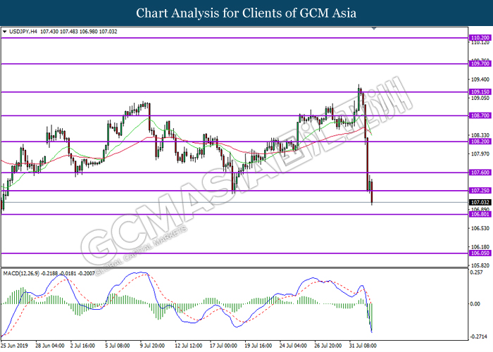USDJPY, H4: USDJPY telah didagang dengan lebih rendah berikutan dengan pemecahan dari tahap sokongan sebelumnya di 107.25. MACD yang menunjukkan momentum bearish yang berterusan mencadangkan pasangan ini untuk melanjutkan kerugiannya ke arah tahap sokongan 106.80.