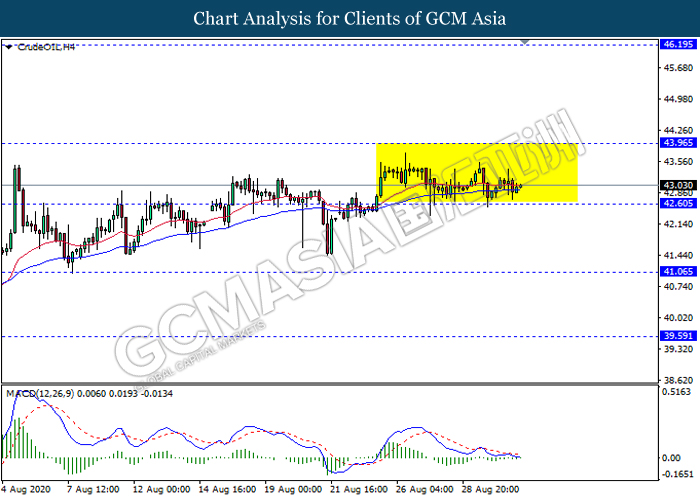 CrudeOIL, H4: Harga minyak mentah kekal didagang dalam saluran sisi sementara ia sedang menguji berhampiran dengan tahap sokongan 42.60. Namun, MACD yang memaparkan isyarat bias bearish mencadangkan komoditi ini untuk didagang dengan lebih rendah selepas ia memecah tahap sokongan tersebut.
