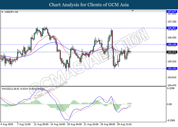 USDJPY, H4: USDJPY telah didagang dengan lebih tinggi susulan dengan lantunan dari paras rendahnya. MACD yang memaparkan isyarat momentum bullish mencadangkan pasangan ini untuk melanjutkan keuntungannya dalam jangka pendek ke arah tahap rintangan 106.25.