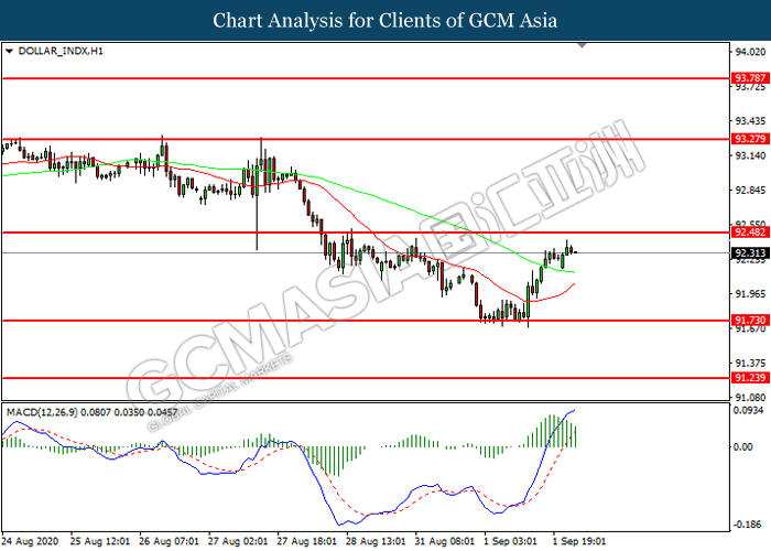 DOLLAR_INDX, H1: Indeks dolar telah didagang dengan lebih tinggi sementara kini menguji di tahap rintangan 92.50. Namun, MACD yang memaparkan momentum bullish yang berkurangan mencadangkan indeks tersebut untuk mengalami pembetulan teknikal bagi jangka pendek.