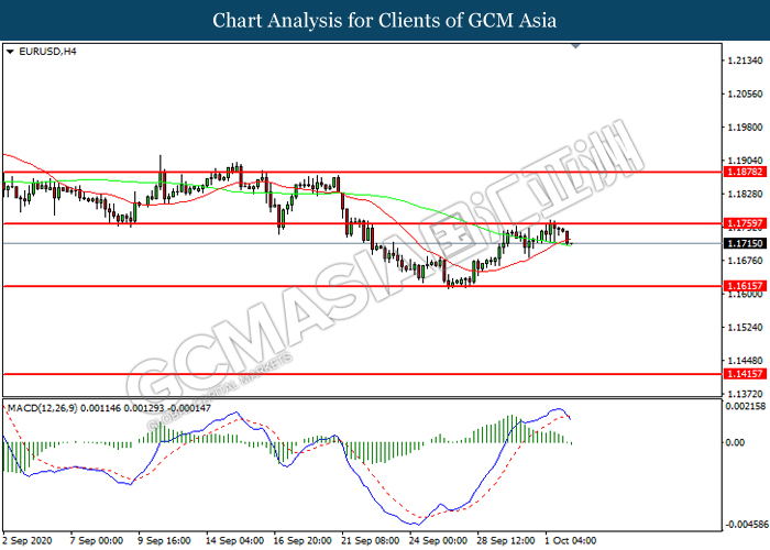 EURUSD, H4: EURUSD telah didagang dengan lebih rendah selepas ia berundur dari tahap rintangan 1.1760. MACD yang memaparkan momentum bearish mencadangkan pasangan ini untuk melanjutkan kerugiannya ke arah tahap sokongan 1.1615.