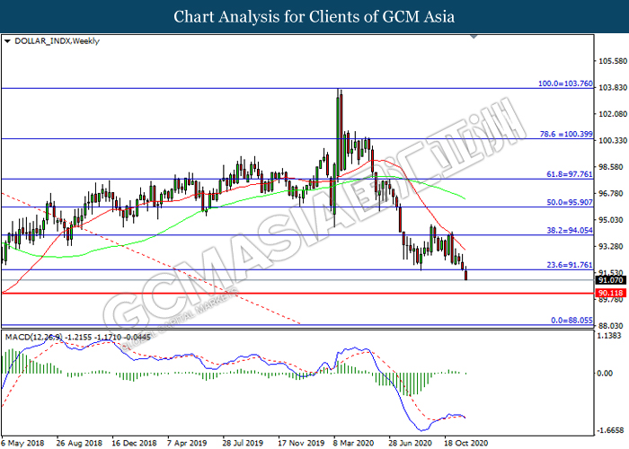 DOLLAR_INDX, Weekly: Indeks dolar telah memecah tahap sokongan terdahulu sebanyak 91.75. MACD yang memaparkan momentum bearish mencadangkan indeks tersebut untuk melanjutkan kerugiannya ke arah tahap sokongan 90.10.