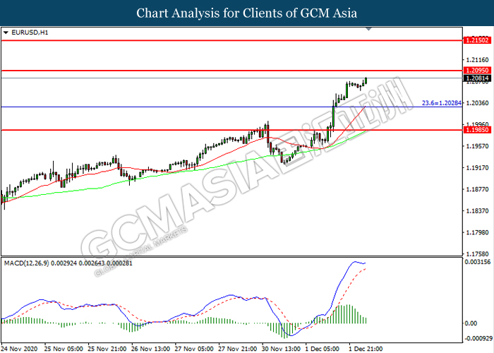 EURUSD, H1: EURUSD telah didagang dengan lebih tinggi sementara kini menguji di tahap rintangan 1.2095. Namun, MACD yang memaparkan momentum bullish yang berkurangan mencadangkan pasangan ini untuk mengalami pembetulan teknikal bagi jangka pendek.