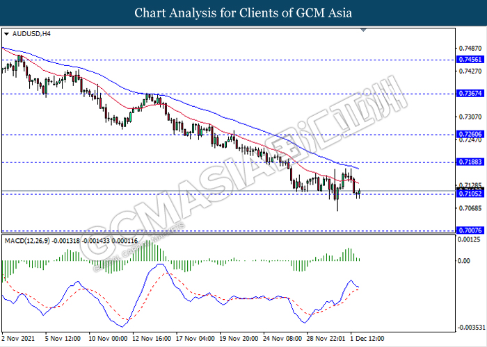 Dolar Australia yang didagang terhadap dolar dan pasangan mata wang lain kekal lemah dan jatuh di tengah-tengah data perdagangan yang bercampurun dari Australia. Dari segi data, data Trade Balance Australia telah meningkat dan melebihi ramalan pasaran sebanyak 11000m kepada 11220M untuk bulan Oktober. Walau bagaimanapun, butiran menunjukkan bahawa data Import menyusut lebih daripada bacaan sebelumnya sebanyak -2.0% kepada -3.0% manakala data Eksport bertambah baik kepada -3.0% daripada -6.0% sebelumnya. Selain itu, data Home Loans juga turun di bawah jangkaan pasaran sebanyak -1.0% kepada -4.1% di mana data Investment Lending for Home Loans juga susut kepada 1.1% daripada bacaan sebelumnya sebanyak 1.4%. Sebaliknya, kebimbangan terhadap virus Omicron dan kemungkinan untuk sekatan turut mempengaruhi dolar Aussie. Australia kini dalam keadaan berjaga-jaga selepas pihak berkuasa baru-baru ini menemui pengembara antarabangsa yang kemungkinan besar dijangkiti varian Omicron telah menghabiskan masa dalam komuniti. Pada masa penulisan, AUD/USD jatuh sebanyak 0.11% kepada $0.7113.