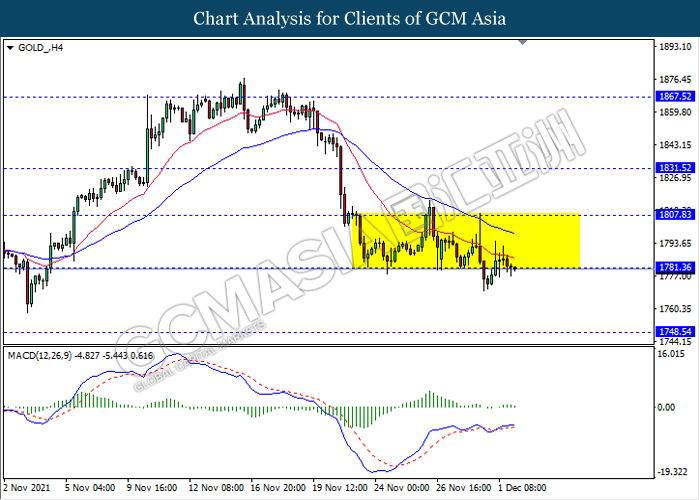 GOLD_, H4: Harga emas kekal didagang dalam saluran sisi sementara ia sedang menguji tahap sokongan 1781.35. Namun, MACD yang memaparkan isyarat momentum bullish yang berkurangan mencadangkan komoditi ini untuk didagang dengan lebih rendah selepas ia memecah tahap sokongan tersebut.