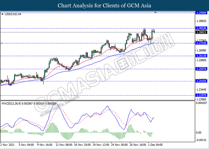 USDCAD, H4: USDCAD telah didagang dengan lebih tinggi sementara ia sedang menguji berhampiran dengan tahap rintangan 1.2835. MACD yang memaparkan isyarat momentum bullish dengan formasi silang emas mencadangkan pasangan ini untuk melanjutkan keuntungannya selepas ia memecah tahap rintangan tersebut.