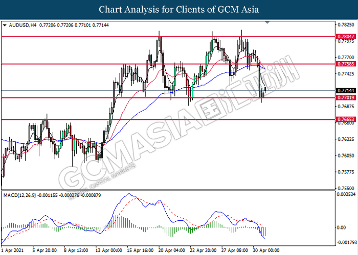 AUDUSD, H4: AUDUSD telah didagang dengan lebih tinggi selepas ia melantun dari tahap sokongan di 0.7700. MACD yang memaparkan momentum bearish yang berkurangan mencadangkan pasangan ini untuk melanjutkan keuntungannya dan menuju ke tahap rintangan di 0.7760.
