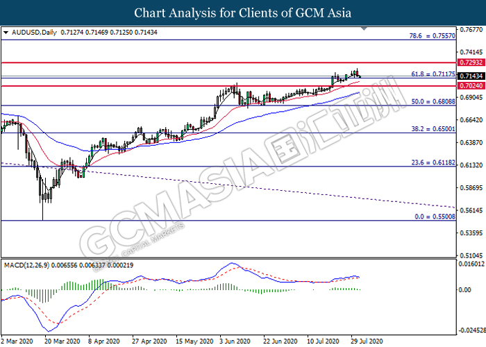 AUDUSD, Daily: AUDUSD telah didagang dengan lebih tinggi selepas ia memecah tahap rintangan sebelumnya di 0.7115. Namun, MACD yang memaparkan isyarat momentum bullish yang berkurangan mencadangkan pasangan ini untuk mengalami pembetulan teknikal dan menuju ke tahap yang lebih rendah.