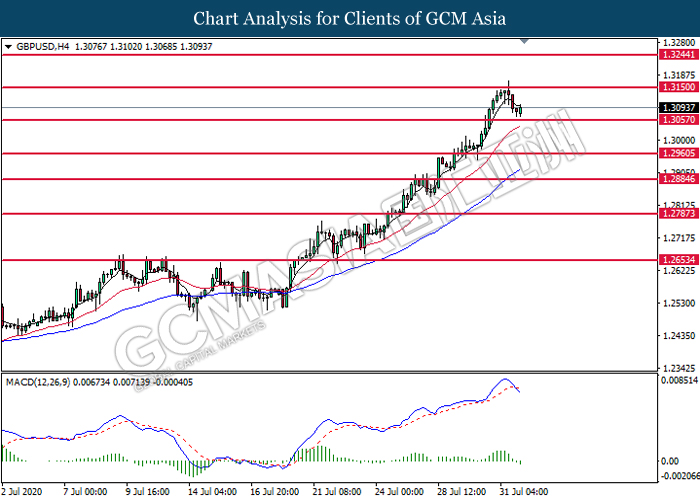 GBPUSD, H4: GBPUSD telah didagang dengan lebih rendah selepas ia berundur dari tahap rintangan di 1.3150. MACD yang memaparkan isyarat momentum bearish yang berterusan mencadangkan pasangan ini untuk didagang dengan lebih rendah dan menuju ke arah tahap sokongan di 1.3055.